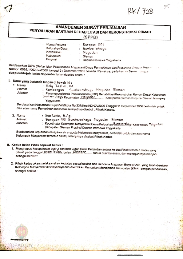 Amandemen Surat Perjanjian Penyaluran Bantuan Rehabilitasi dan Rekonstruksi Rumah (SPPB), Nama Kelompok Barepan 001, Kel/Desa Sumber Rahayu, Kecamatan Moyudan, Kabupaten Sleman, Propinsi Daerah Istimewa Yogyakarta.