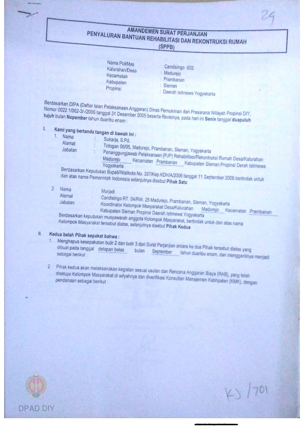 Amandemen Surat Perjanjian Penyaluran Bantuan Rehabilitasi dan Rekonstruksi Rumah (SPPB), Nama Kelompok Candisingo 001, 002, Kel/Desa Madurejo, Kecamatan Prambanan, Kabupaten Sleman, Propinsi Daerah Istimewa Yogyakarta.