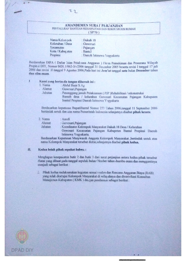 Amandemen Surat Perjanjian Penyaluran Bantuan Rehabilitasi dan Rekonstruksi Rumah (SPPB), Nama Kelompok Dukuh 18 s.d 29, Kel/Desa Guwosari, Kecamatan Pajangan, Kabupaten Bantul, Propinsi Daerah Istimewa Yogyakarta