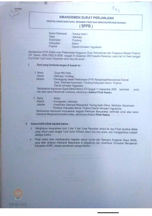 Amandemen Surat Perjanjian Penyaluran Bantuan Rehabilitasi dan Rekonstruksi Rumah (SPPB), Nama Kelompok Karang Asem 1 s.d. 22, Kel/Desa Seloharjo, Kecamatan Pundong, Kabupaten Bantul, Propinsi Daerah Istimewa Yogyakarta.