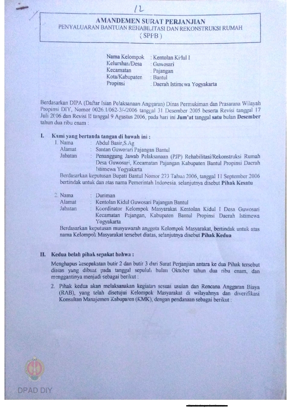 Amandemen Surat Perjanjian Penyaluran Bantuan Rehabilitasi dan Rekonstruksi Rumah (SPPB), Nama Kelompok Kentolan Kidul 1 & 2, Kel/Desa Guwosari, Kecamatan Pajangan, Kabupaten Bantul, Propinsi Daerah Istimewa Yogyakarta.
