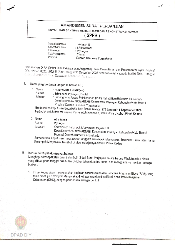 Amandemen Surat Perjanjian Penyaluran Bantuan Rehabilitasi dan Rekonstruksi Rumah (SPPB), Nama Kelompok Masyarakat Mojosari, Kel/Desa Srimartani, Kecamatan Piyungan, Kabupaten Bantul, Provinsi Daerah Istimewa Yogyakarta.