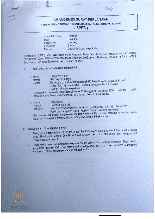 Amandemen Surat Perjanjian Penyaluran Bantuan Rehabilitasi dan Rekonstruksi Rumah (SPPB), Nama Kelompok Potahan 1 s.d. 4, Kel/Desa Seloharjo, Kecamatan Pundong, Kabupaten Bantul, Propinsi Daerah Istimewa Yogyakarta.