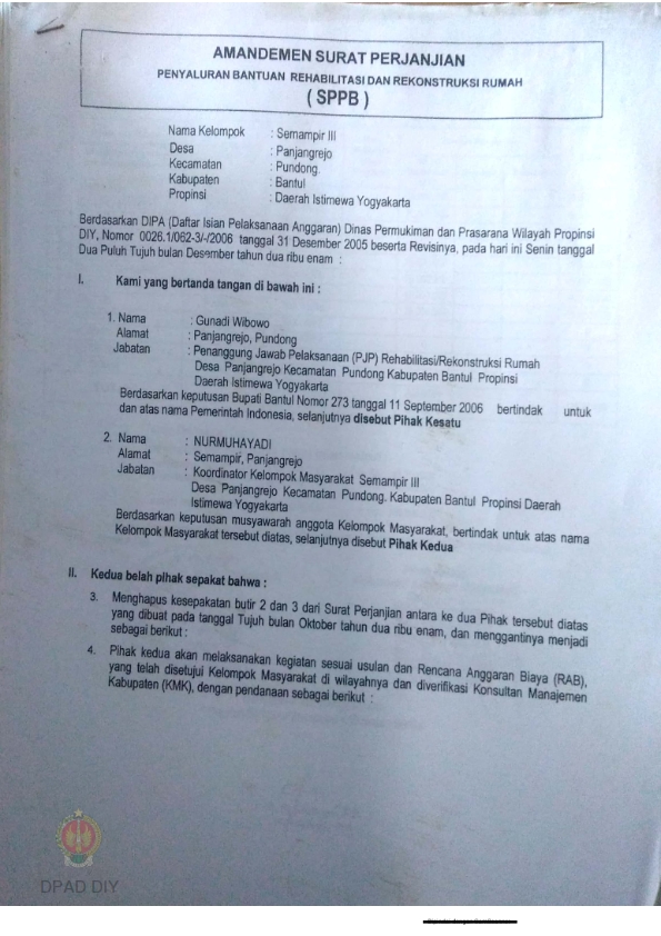 Amandemen Surat Perjanjian Penyaluran Bantuan Rehabilitasi dan Rekonstruksi Rumah (SPPB), Nama Kelompok Semampir III, VII, IX s.d. XVIII, Kel/Desa Panjangrejo, Kecamatan Pundong, Kabupaten Bantul, Propinsi Daerah Istimewa Yogyakarta.