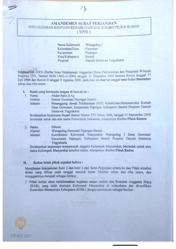 Amandemen Surat Perjanjian Penyaluran Bantuan Rehabilitasi dan Rekonstruksi Rumah (SPPB), Nama Kelompok Watu gedung I s.d. III, Desa Guwosari, Kecamatan Pajangan, Kabupaten Bantul, Propinsi Daerah Istimewa Yogyakarta.