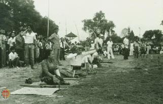 Bapak Sutrisno (tengah) sedang beraksi pada lomba panahan di lapangan Badung, Denpasar Bali