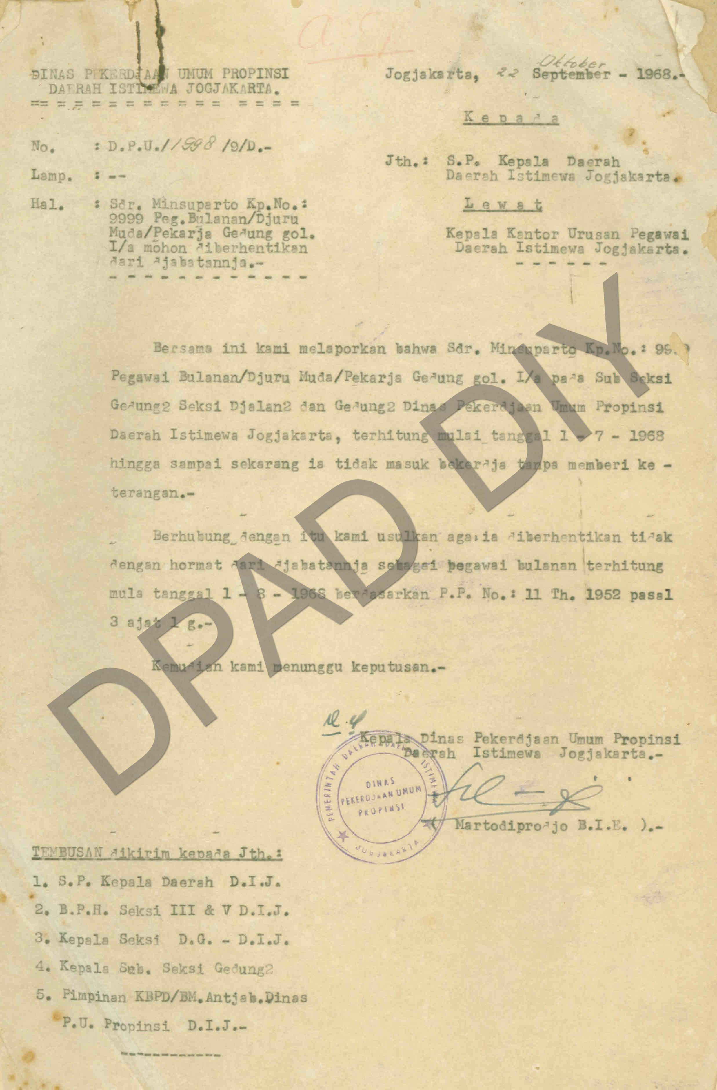 Berkas pemberhentian dengan tidak hormat kepada pegawai Dinas Pekerjaan Umum karena tidak masuk bekerja tanpa keterangan