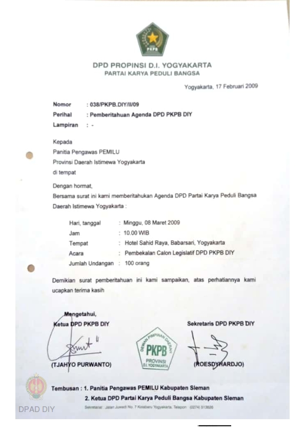 Surat masuk No: 038/PKPB.DIY/II/09 dari DPD Propinsi DIY PKPB perihal Pemberitahuan Agenda DPD PKPB DIY hari Minggu tanggal 8 Maret 2009 pukul 10.00 WIB di Hotel Sahid Raya, Babarsari, Yogyakarta, acara Pembekalan Calon Legislatif DPD PKPB DIY.