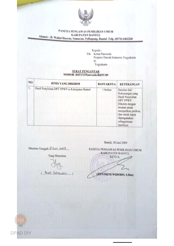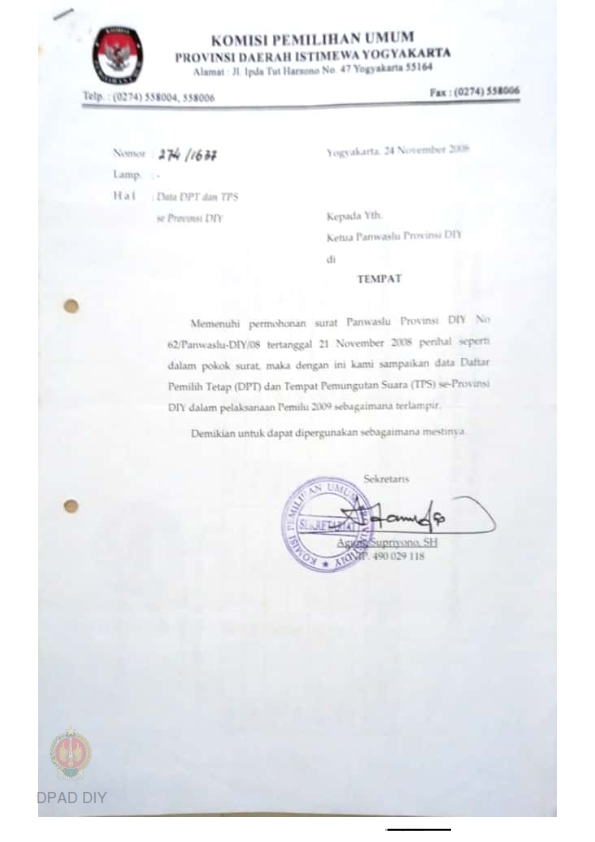Surat dari Komisi Pemilihan Umum Provinsi DIY untuk Ketua Panwaslu Provinsi DIY perihal Data DPT dan TPS se-Provinsi DIY dalam pelaksanaan Pemilu 2009.