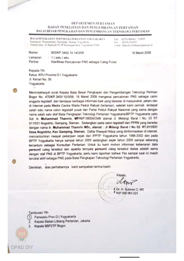 Surat dari Balai Pengkajian Teknologi Pertanian Yogyakarta perihal Klarifikasi Pencalonan PNS sebagai Caleg Pusat atas nama Ir. Muh Thamrin, MSc.