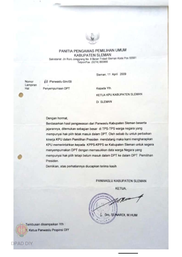 Surat dari Panwaslu Kabupaten Sleman perihal penyempurnaan DPT kepada KPPS-KPPS se-Kabupaten Sleman.