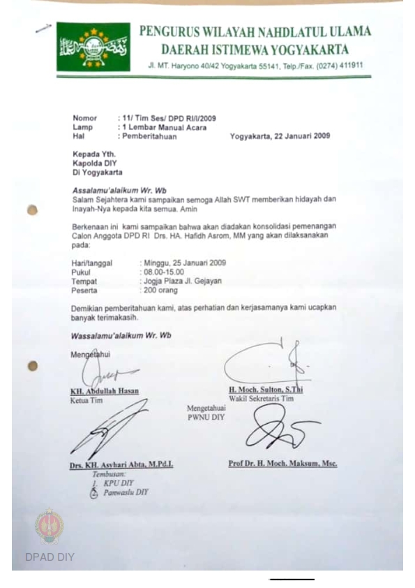 Surat dari Pengurus Wilayah Nahdlatul Ulama DIY untuk Ketua Panwaslu Provinsi DIY perihal pemberitahuan pelaksanaan konsolidasi pemenangan calon Anggota DPD RI Drs. HA. Hafidh Asram, MM pada tanggal 25 Juni 2009 .