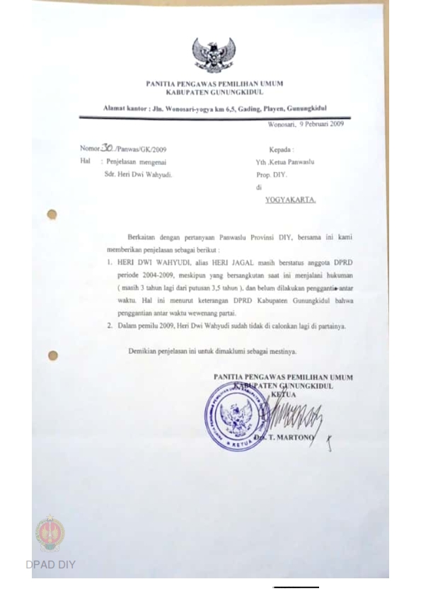 Surat dari Panitia Panwaslu Provinsi DIY perihal penjelasan mengenai Sdr. Heri Dei Wahyudi masih berstatus anggota DPRD Gunungkidul periode 2004-2009.