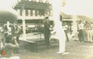 Menteri Ali Murtopo memberikan sambutan selaku pejabat dari Pusat dalam rangka penerimaan penghargaan Parasamya di Kab. Sleman beserta ibu didampingi Sri Paku Alam VIII dengan para pejabat Muspida Sleman berdiri di panggung kehormatan.
