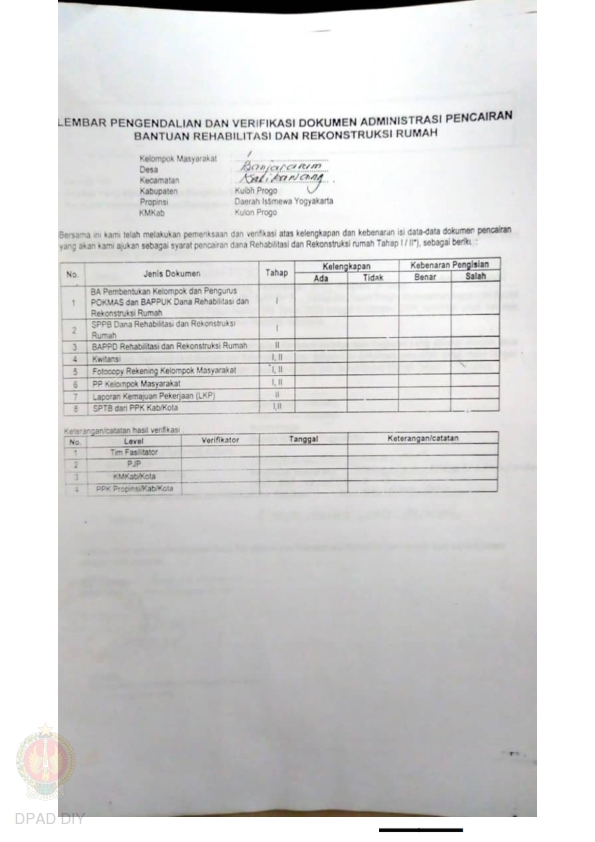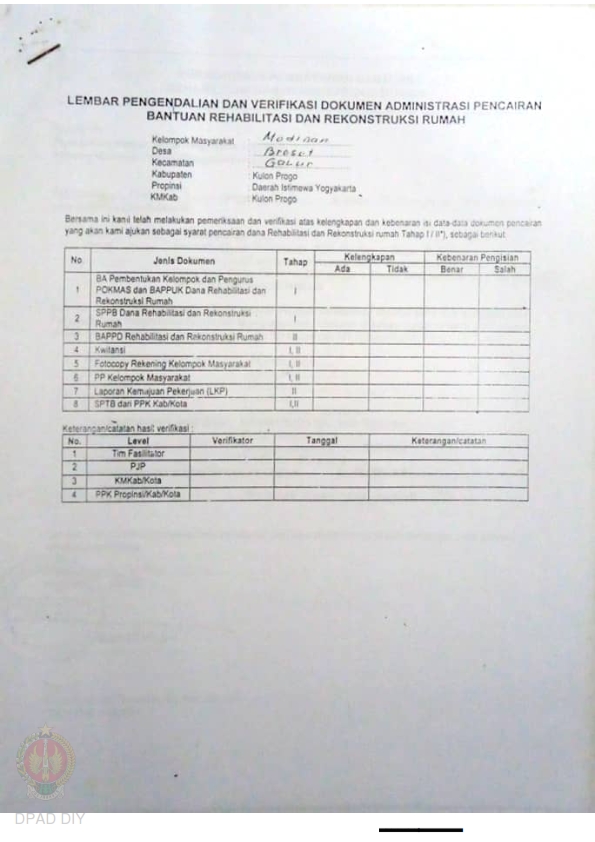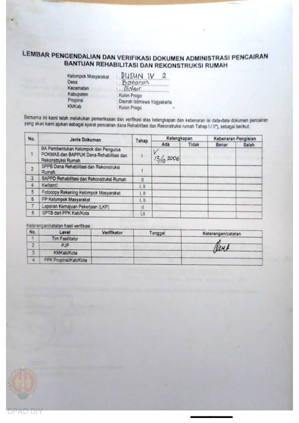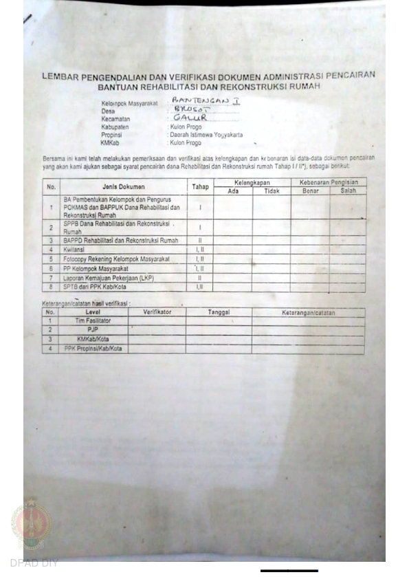 lembar Pengendalian dan Verifikasi Dokumen Administrasi Pencairan Bantuan Rehabilitasi dan Rekonstruksi Rumah, Nama Kelompok Bantengan I dan II, Kel/Desa Brosot, Kecamatan Galur, Kabupaten Kulon Progo, Propinsi Daerah Istimewa Yogyakarta.