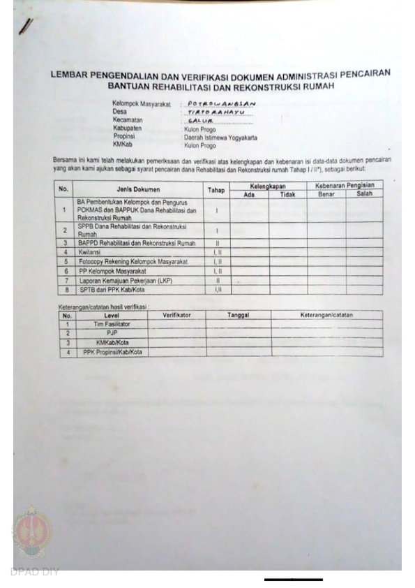lembar Pengendalian dan Verifikasi Dokumen Administrasi Pencairan Bantuan Rehabilitasi dan Rekonstruksi Rumah, Nama Kelompok Potrowangsan, Kel/Desa Tirtorahayu, Kecamatan Galur, Kabupaten Kulon Progo, Propinsi Daerah Istimewa Yogyakarta.