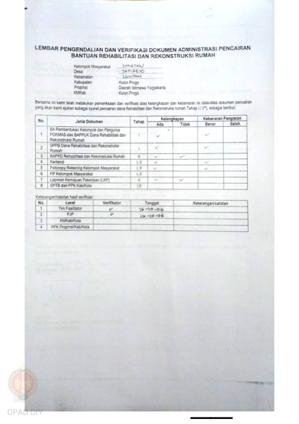 lembar Pengendalian dan Verifikasi Dokumen Administrasi Pencairan Bantuan Rehabilitasi dan Rekonstruksi Rumah, Nama Kelompok Jimatan, Kel/Desa Jatirejo, Kecamatan Lendah, Kabupaten Kulon Progo, Propinsi Daerah Istimewa Yogyakarta.