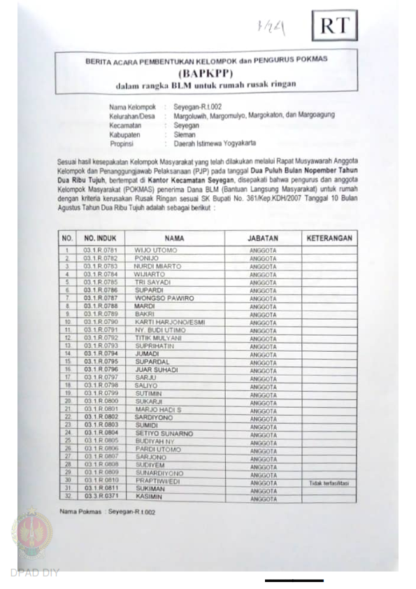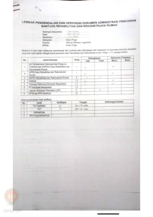 Checklist Kelengkapan Dokumen untuk Pencairan Dana Rehabilitasi dan Rekonstruksi Rumah Rusak Ringan Nama Kelompok Sayegan RT 002, Kel/Desa Margoluwih, Margokaton, Margoagung, Kecamatan Sayegan, Kabupaten Sleman, Propinsi Daerah Istimewa Yogyakarta.