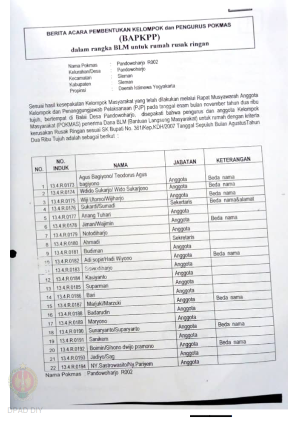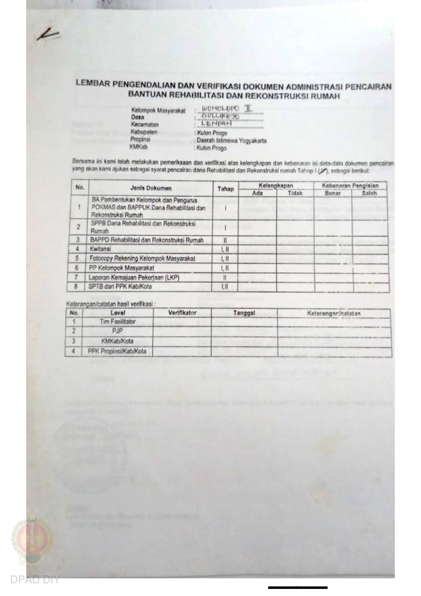 Checklist Kelengkapan Dokumen untuk Pencairan Dana Rehabilitasi dan Rekonstruksi Rumah Rusak Ringan Nama Kelompok Pendowoharjo 002, 012, Kel/Desa Pendowoharjo, Kecamatan Sleman, Kabupaten Sleman, Propinsi Daerah Istimewa Yogyakarta.