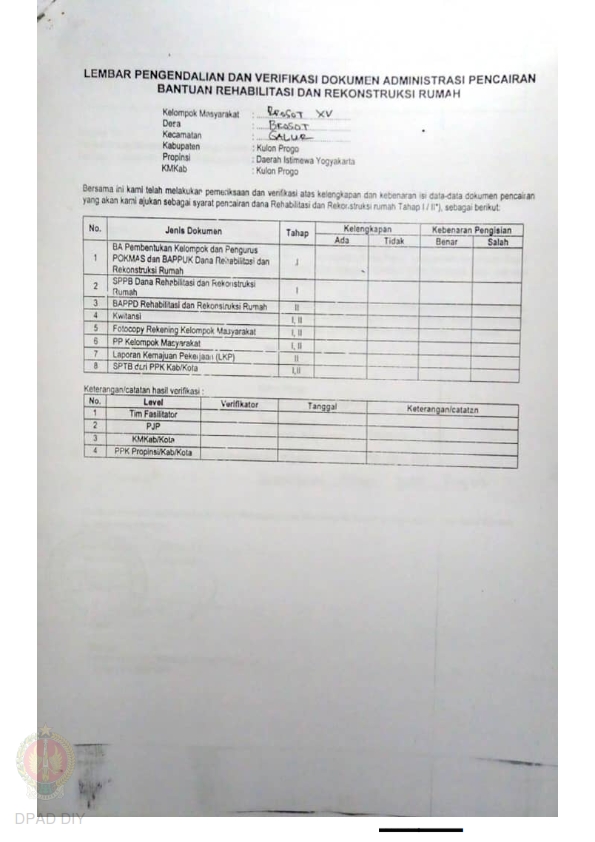 lembar Pengendalian dan Verifikasi Dokumen Administrasi Pencairan Bantuan Rehabilitasi dan Rekonstruksi Rumah, Nama Kelompok Brosot XV dan XVI, Kel/Desa Brosot, Kecamatan Galur, Kabupaten Kulon Progo, Propinsi Daerah Istimewa Yogyakarta.