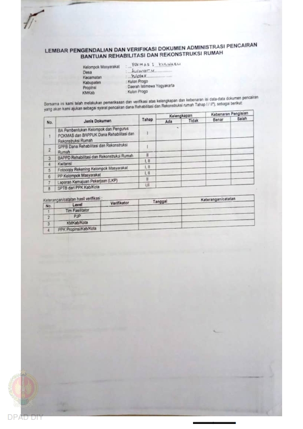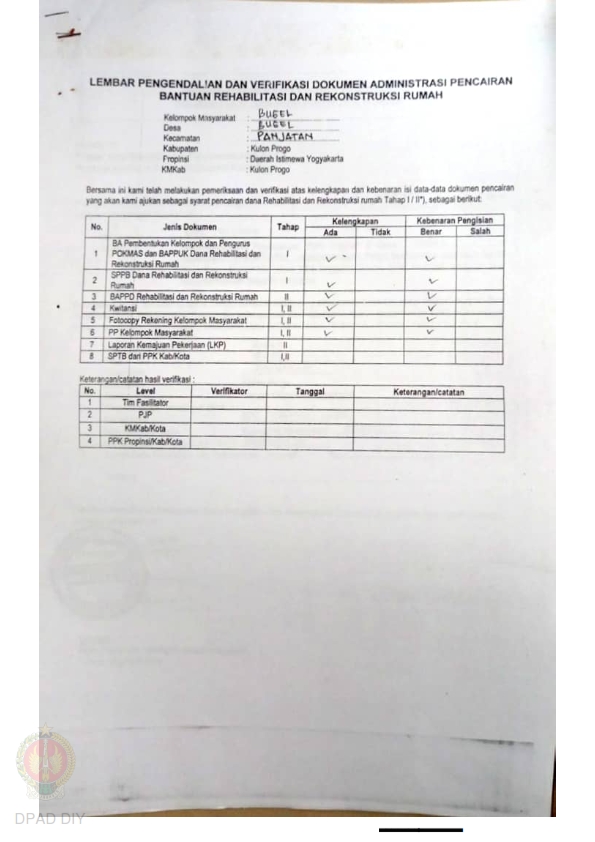 lembar Pengendalian dan Verifikasi Dokumen Administrasi Pencairan Bantuan Rehabilitasi dan Rekonstruksi Rumah, Nama Kelompok I dan II Pathuk Lor Galur, Kel/Desa Tirtorahayu, Kecamatan Galur, Kabupaten Kulon Progo, Propinsi Daerah Istimewa Yogyakarta.