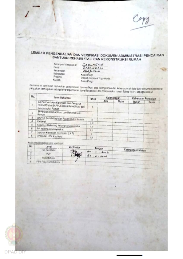 lembar Pengendalian dan Verifikasi Dokumen Administrasi Pencairan Bantuan Rehabilitasi dan Rekonstruksi Rumah, Nama Kelompok Gabungan, Kel/Desa Garongan, Kecamatan Panjatan, Kabupaten Kulon Progo, Propinsi Daerah Istimewa Yogyakarta.