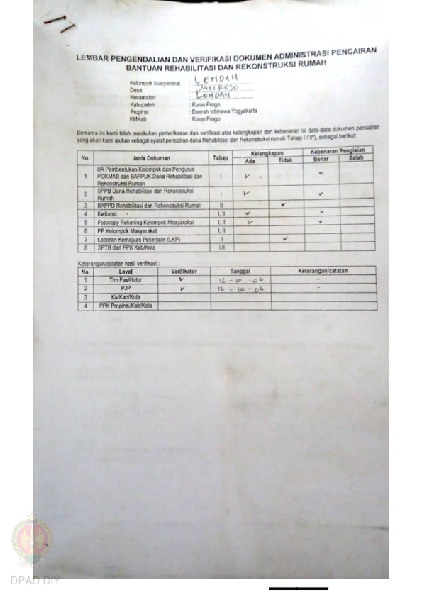 lembar Pengendalian dan Verifikasi Dokumen Administrasi Pencairan Bantuan Rehabilitasi dan Rekonstruksi Rumah, Nama Kelompok Dusun Sedan, Kel/Desa Sidorejo, Kecamatan Lendah, Kabupaten Kulon Progo, Propinsi Daerah Istimewa Yogyakarta.