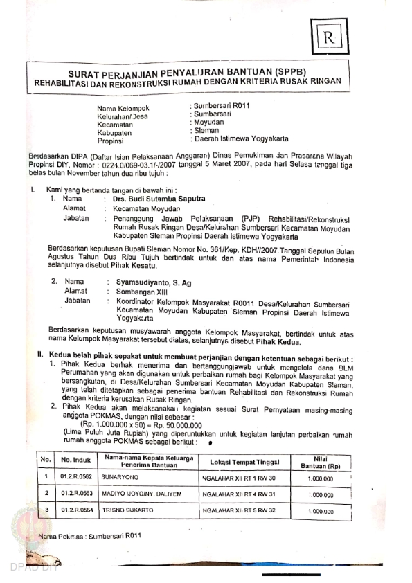Checklist Kelengkapan Dokumen untuk Pencairan Dana Rehabilitasi dan Rekonstruksi Rumah Rusak Ringan Nama Kelompok Sumbersari R 0001, R 0008, R 0011, Kel/Desa Sumbersari, Kecamatan Moyudan, Kabupaten Sleman, Propinsi Daerah Istimewa Yogyakarta.