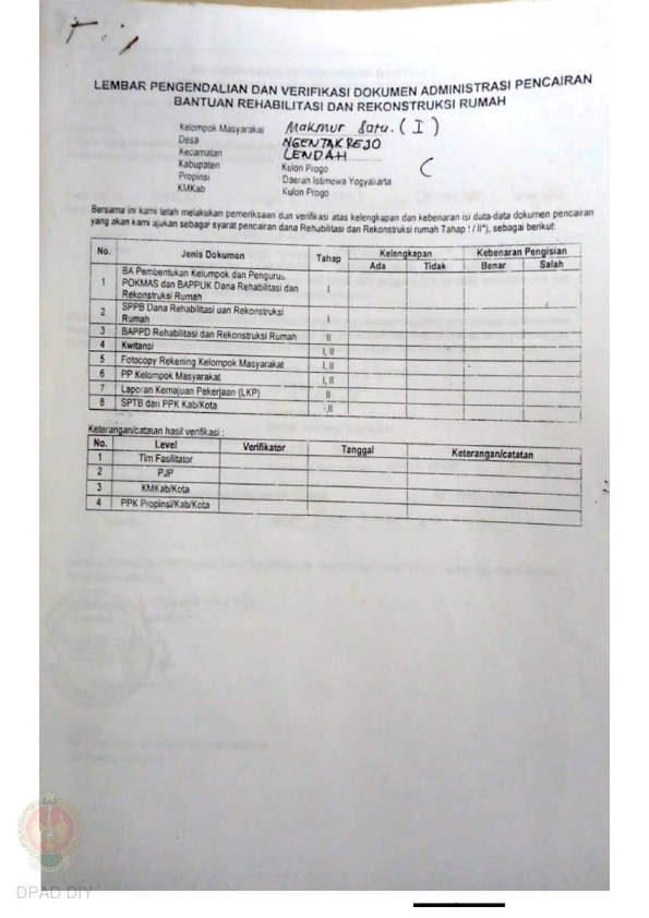 lembar Pengendalian dan Verifikasi Dokumen Administrasi Pencairan Bantuan Rehabilitasi dan Rekonstruksi Rumah, Nama Kelompok Botokan I dan II, Kel/Desa Jatirejo, Kecamatan Lendah, Kabupaten Kulon Progo, Propinsi Daerah Istimewa Yogyakarta.