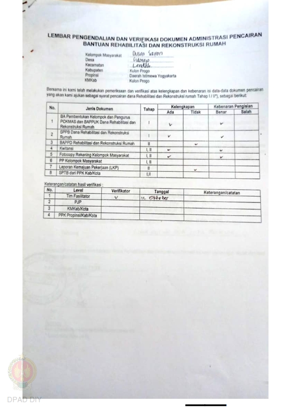 lembar Pengendalian dan Verifikasi Dokumen Administrasi Pencairan Bantuan Rehabilitasi dan Rekonstruksi Rumah, Nama Kelompok Dusun Sapon, Kel/Desa Sidorejo, Kecamatan Lendah, Kabupaten Kulon Progo, Propinsi Daerah Istimewa Yogyakarta.
