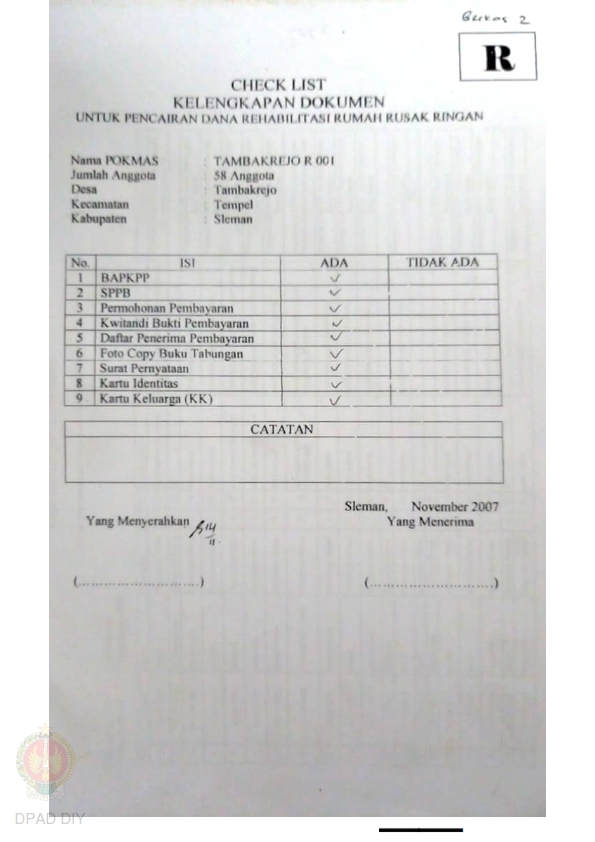 Checklist Kelengkapan Dokumen untuk Pencairan Dana Rehabilitasi dan Rekonstruksi Rumah Rusak Ringan Nama Kelompok Tambakrejo R 001 dan R 002, Kel/Desa Tambakrejo, Kecamatan Tempel, Kabupaten Sleman, Propinsi Daerah Istimewa Yogyakarta.