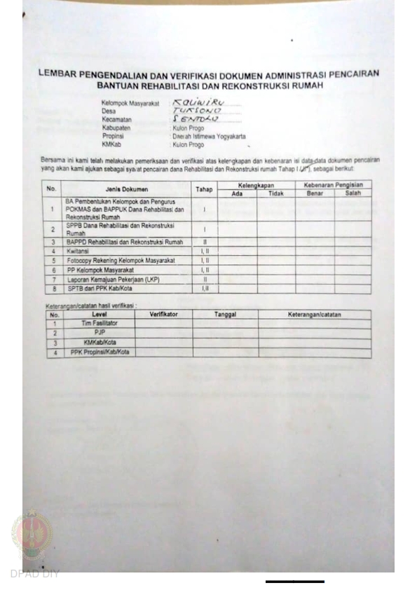 lembar Pengendalian dan Verifikasi Dokumen Administrasi Pencairan Bantuan Rehabilitasi dan Rekonstruksi Rumah, Nama Kelompok Kaliwiru, Kel/Desa Tuksono, Kecamatan Sentolo, Kabupaten Kulon Progo, Propinsi Daerah Istimewa Yogyakarta.