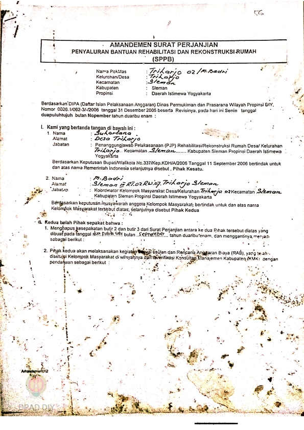 Amandemen Surat Perjanjian Penyaluran Bantuan Rehabilitasi dan Rekonstruksi Rumah (SPPB), Nama Kelompok Jambon 002, Kel/Desa Trihanggo, Kecamatan Gamping, Kabupaten Sleman, Propinsi Daerah Istimewa Yogyakarta.