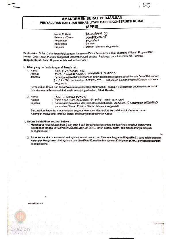 Amandemen Surat Perjanjian Penyaluran Bantuan Rehabilitasi dan Rekonstruksi Rumah (SPPB), Nama Kelompok Sangubanyu 001, Kel/Desa Sumber Rahayu, Kecamatan Moyudan, Kabupaten Sleman, Propinsi Daerah Istimewa Yogyakarta.