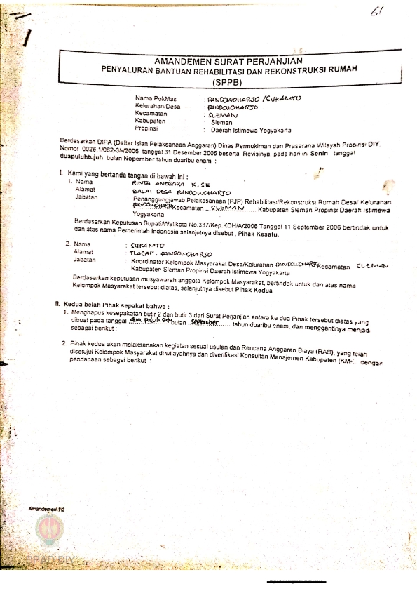Amandemen Surat Perjanjian Penyaluran Bantuan Rehabilitasi dan Rekonstruksi Rumah (SPPB), Nama Kelompok Pandowoharjo / Sukamto, Kel/Desa Pandowoharjo, Kecamatan Sleman, Kabupaten Sleman, Propinsi Daerah Istimewa Yogyakarta.