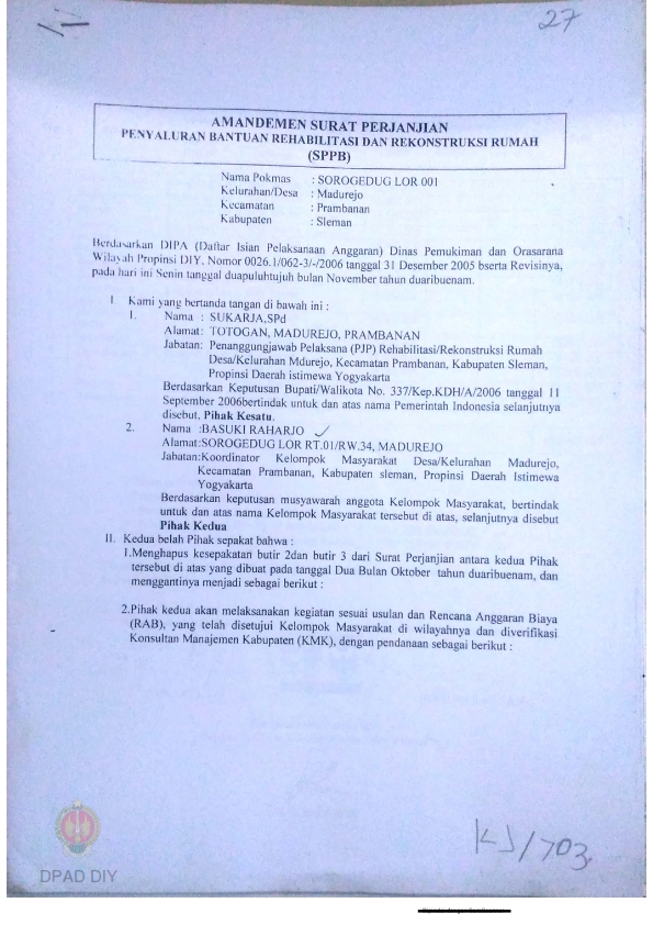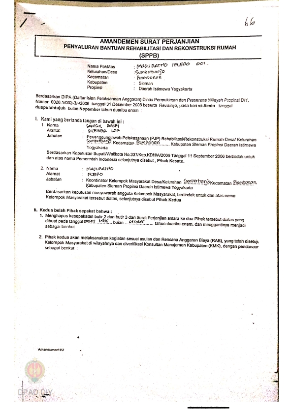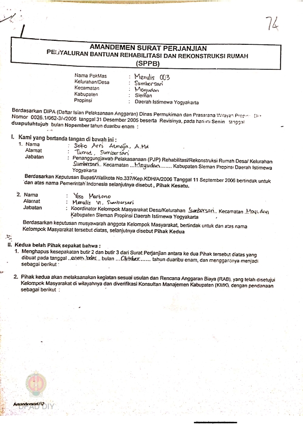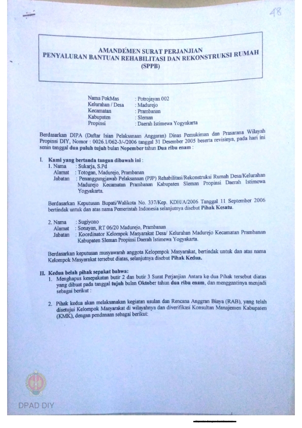 Amandemen Surat Perjanjian Penyaluran Bantuan Rehabilitasi dan Rekonstruksi Rumah (SPPB), Nama Kelompok Potrojayan 002, Kel/Desa Madurejo, Kecamatan Prambanan, Kabupaten Sleman, Propinsi Daerah Istimewa Yogyakarta.