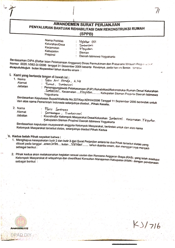 Amandemen Surat Perjanjian Penyaluran Bantuan Rehabilitasi dan Rekonstruksi Rumah (SPPB), Nama Kelompok Karang Anjir 001, Kel/Desa Sumberarum, Kecamatan Moyudan, Kabupaten Sleman, Propinsi Daerah Istimewa Yogyakarta.