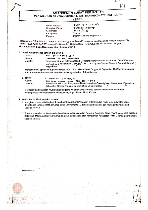 Amandemen Surat Perjanjian Penyaluran Bantuan Rehabilitasi dan Rekonstruksi Rumah (SPPB), Nama Kelompok Gamolong 001, Kel/Desa Sumber Rahayu, Kecamatan Moyudan, Kabupaten Sleman, Propinsi Daerah Istimewa Yogyakarta.