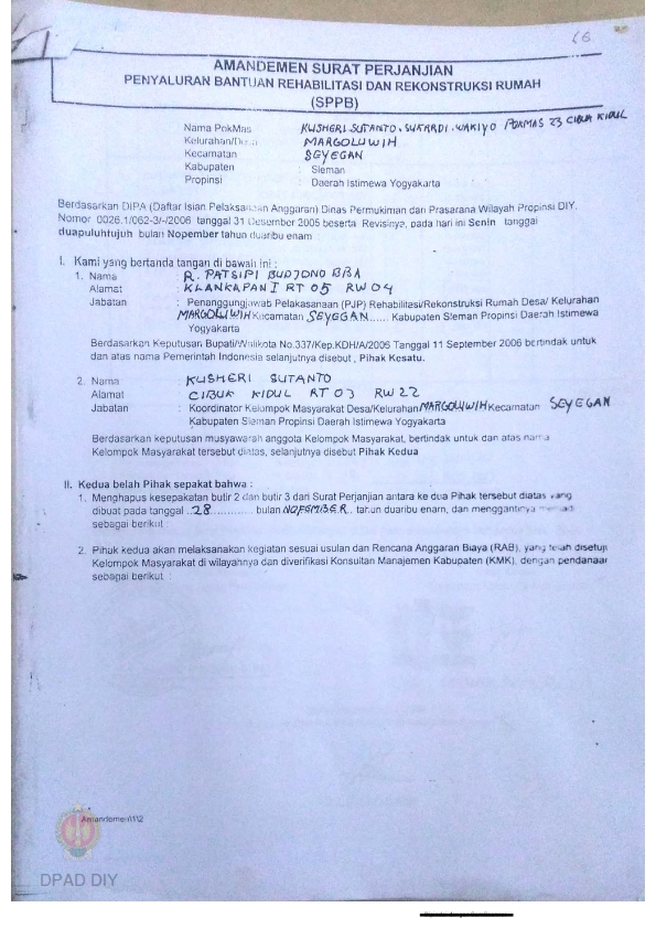Amandemen Surat Perjanjian Penyaluran Bantuan Rehabilitasi dan Rekonstruksi Rumah (SPPB), Nama Kelompok Jitar Dukuh VI 001, Kel/Desa Sumberarum, Kecamatan Moyudan, Kabupaten Sleman, Propinsi Daerah Istimewa Yogyakarta.