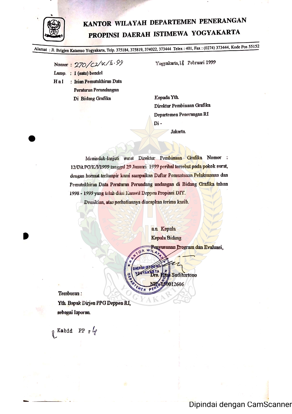 Surat dari Kepala Bidang Penyusunan Program dan Evaluasi Departemen Penerangan Daerah Istimewa Yogyakarta kepada Direktur Pembinaan Grafika Departemen Penerangan Republik Indonesia Jakarta perihal Daftar Pemantauan Pelaksanaan dan Pemutakhiran Data Peraturan Perundang-Undangan di Bidang Grafika tahun 1998-1999, beserta lampiran.