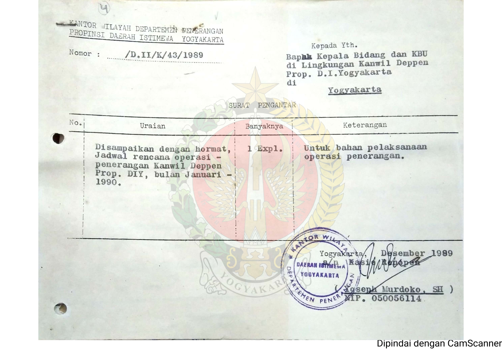 Surat dari Kantor Wilayah Departemen Penerangan Daerah Istimewa Yogyakarta kepada Kepala Bidang dan KBU di Lingkungan Kantor Wilayah Departemen Penerangan Daerah Istimewa Yogyakarta jadwal rencana operasi penerangan Kantor Wilayah Departemen Penerangan bulan Januari 1990, beserta lampiran