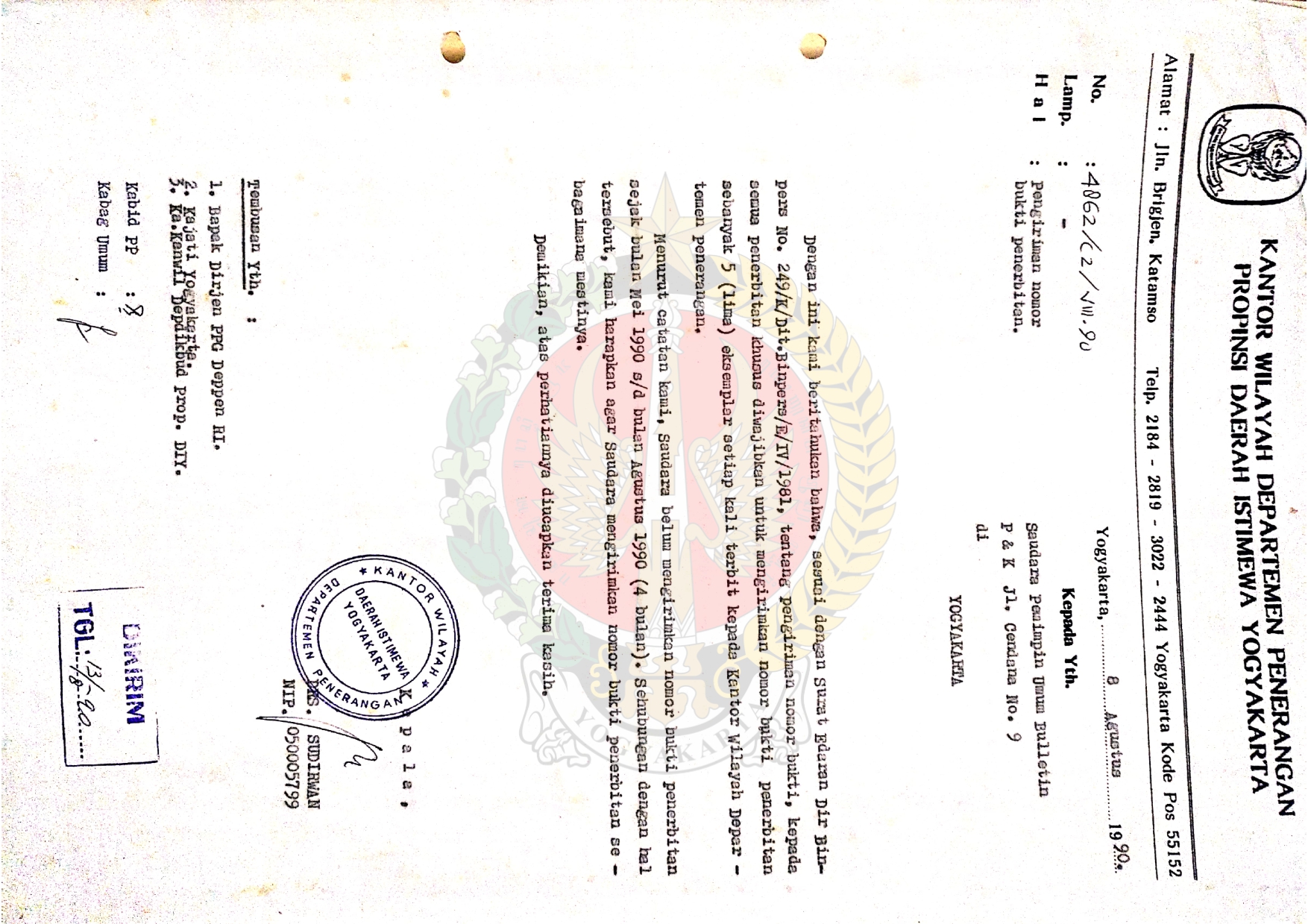 Laporan Bahan Rakerna 1996 Departemen Penerangan Republik Indonesia dengan judul โPemantapan Operasional Penerangan Menyukseskan Pemilu 1997โ dari Kantor Wilayah Departemen Penerangan Provinsi Daerah Istimewa Yogyakarta.