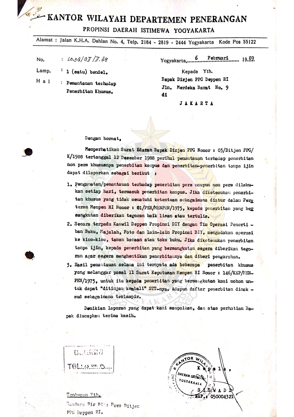 Surat dari Kepala Kantor Wilayah Departemen Penerangan Yogyakarta kepada Direktur Jenderal Pembinaan Pers dan Grafika Departemen Penerangan Republik Indonesia di Jakarta perihal pemantauan terhadap penerbit khusus dan penerbit tanpa izin dapat dilaporkan.