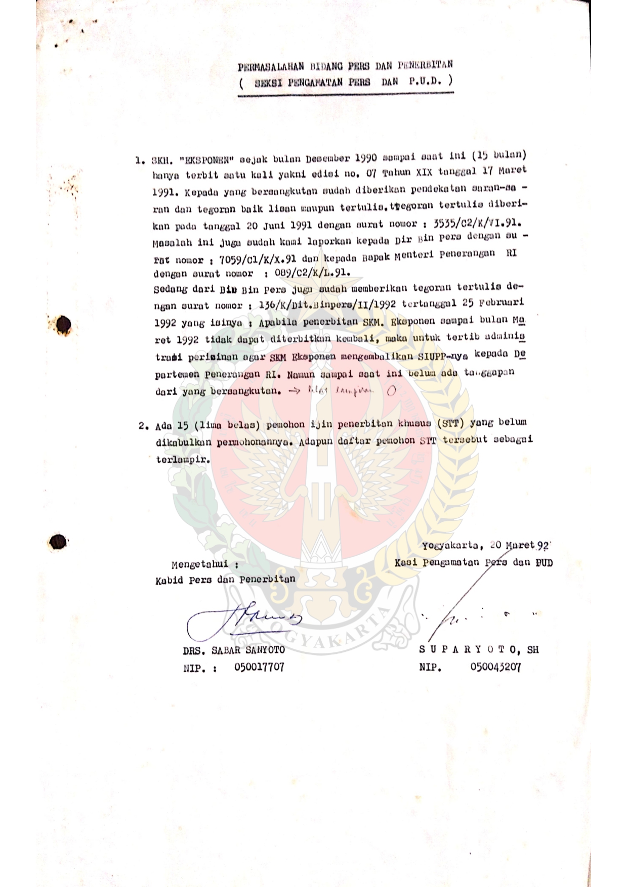 Permasalahan Bidang Pers dan Penerbitan (Seksi Pengamatan Pers dan PUD) dari Kepala Seksi Pengamatan Pers dan PUD dengan mengetahui Kepala Bidang Pers dan Penerbitan.