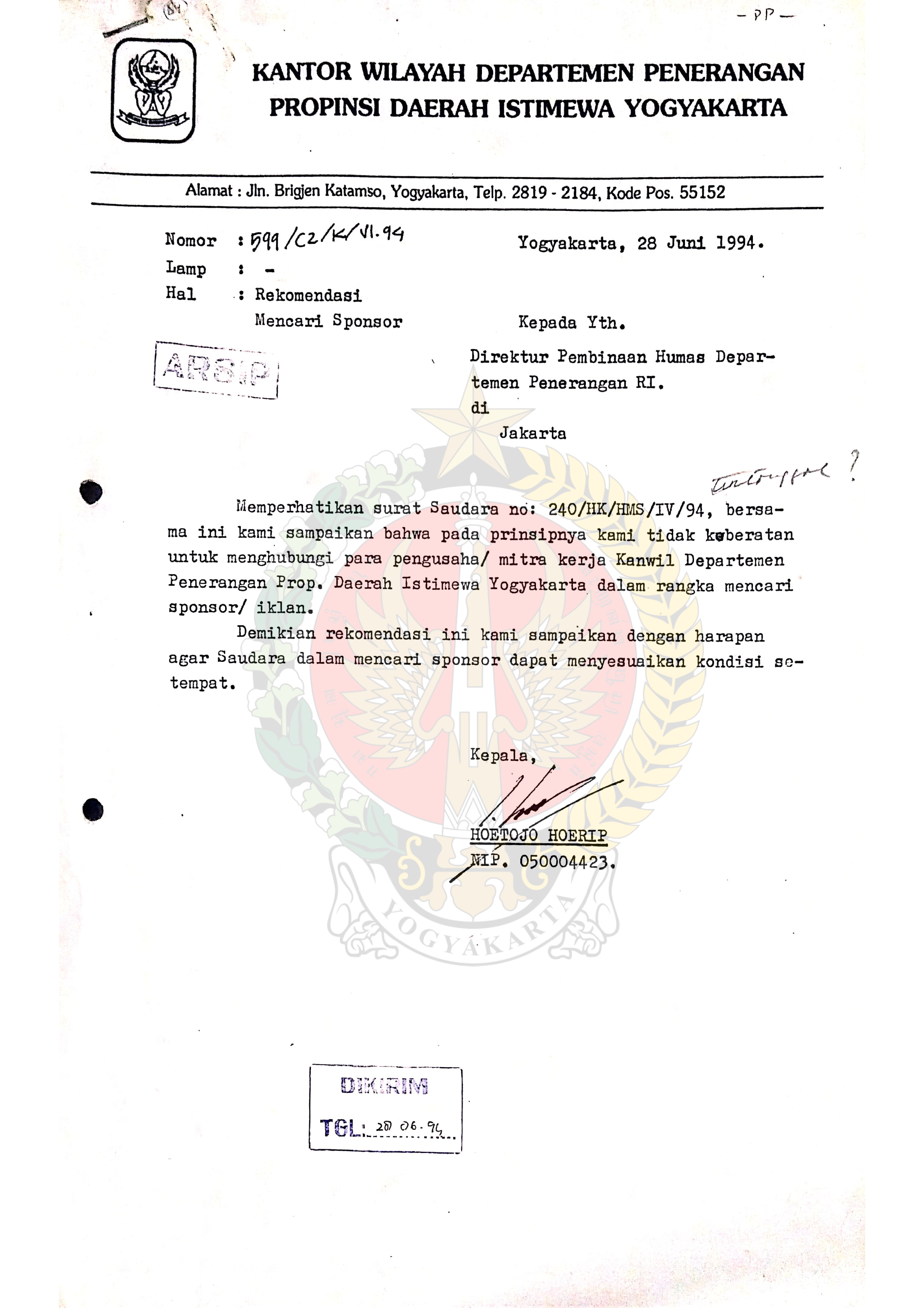 DPAD.ORBA.T26.F.1.53.1495 Surat dari Kepala Kantor Wilayah Departemen Penerangan Provinsi Daerah Istimewa Yogyakarta kepada Direktur Pembinaan Humas Departemen Penerangan RI perihal rekomendasi mencari sponsor untuk menghubungi para pengusaha/mitra kerja Item 28 juni Lihat