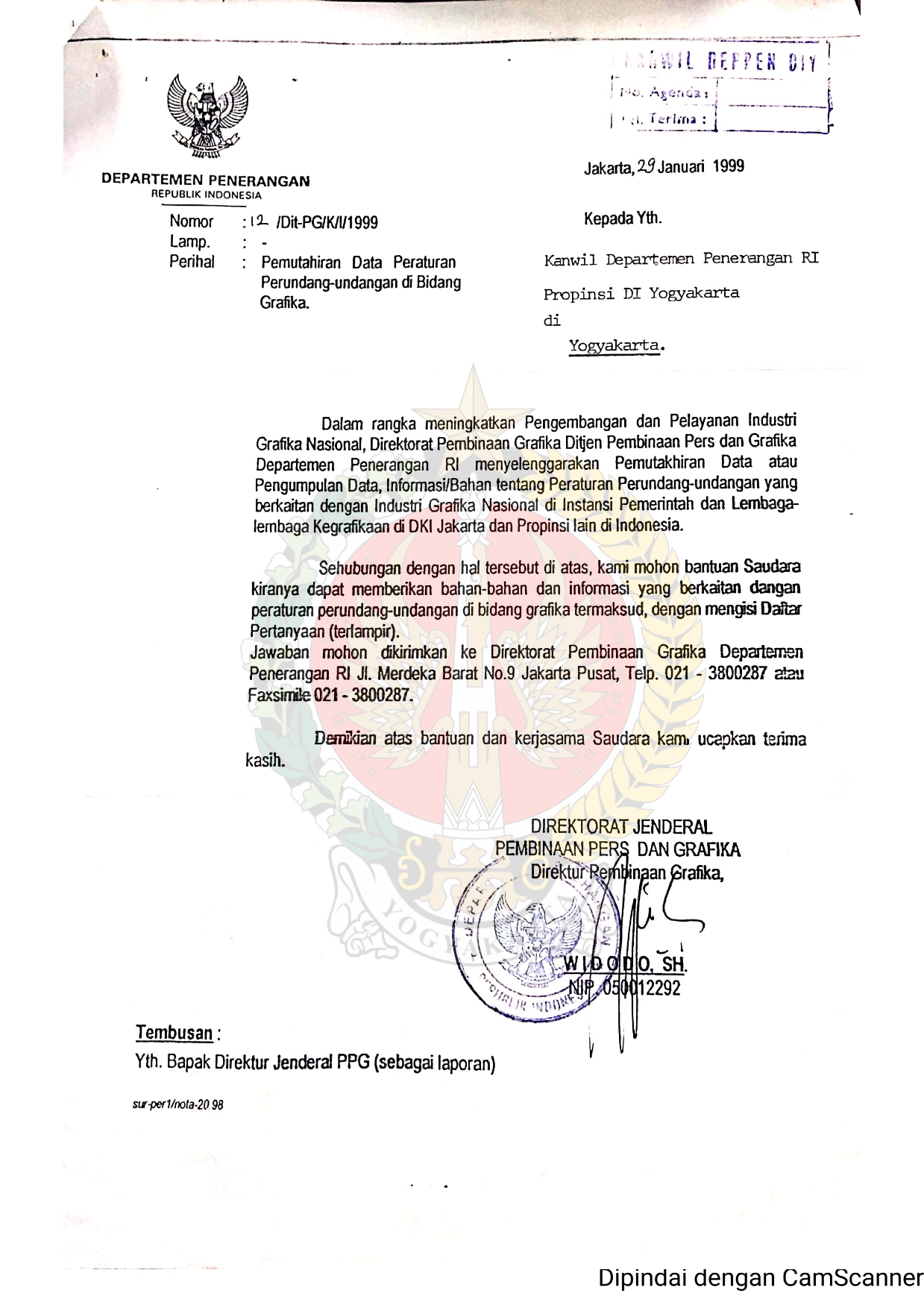 Surat dari Direktorat Jenderal Penerangan Pembinaan Grafika Departemen Penerangan Republik Indonesia Jakarta kepada Kantor Wilayah Departemen Penerangan Daerah Istimewa Yogyakarta perihal Pemutahiran Data Peraturan Perundang-undangan di Bidang Grafika.