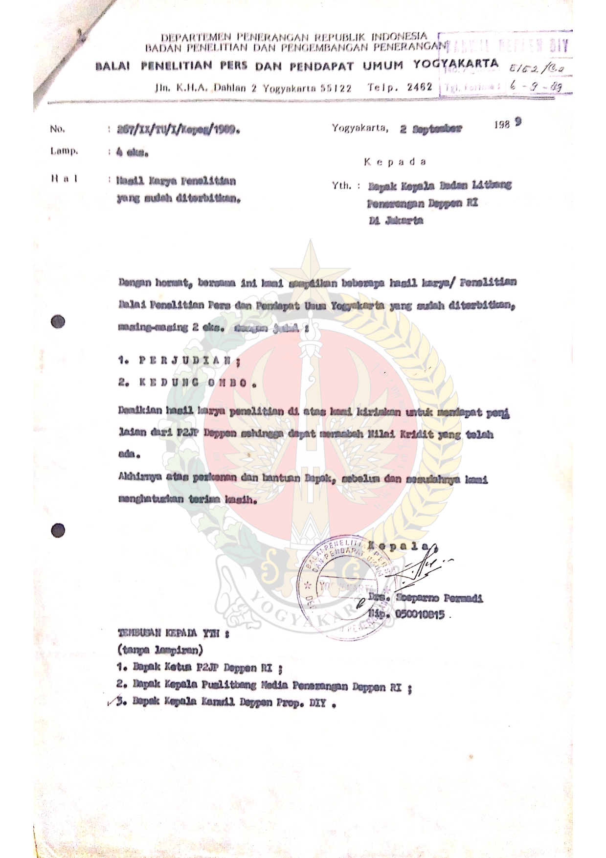 Surat dari Kepala Balai Penelitian Pers dan Pendapatan Umum Yogyakarta kepada Kepala Badan Lingkungan Penerangan Departemen Penerangan Republik Indoesia perihal disampaikan beberapa hasil karya/penelitian Balai Penelitian Pers dan Pendapatan Umum Yogyakarta untuk penilaian dari P2JP Departemen Penerangan agar menambah Nilai Kridit yang ada, tanpa lampiran.