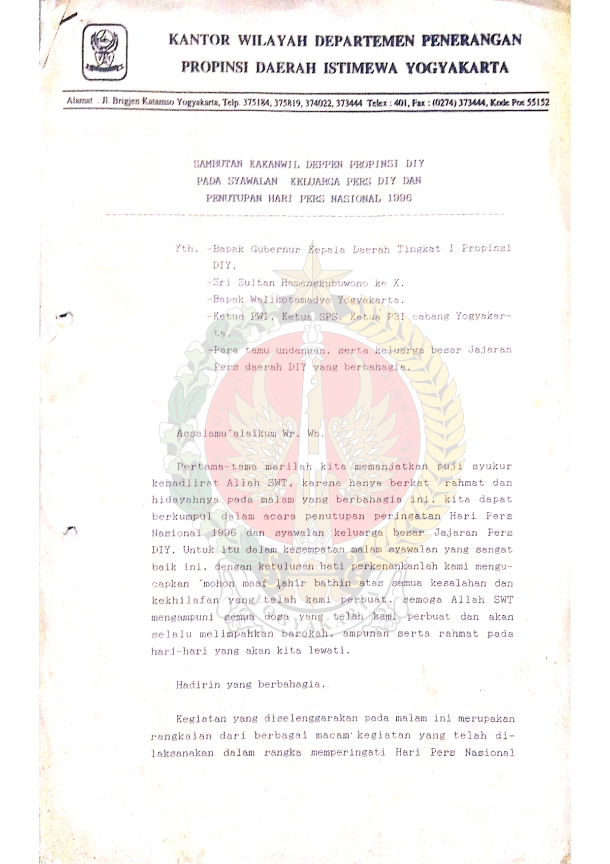 Berkas Sambutan Kepala Kantor Wilayah Departemen Penerangan Provinsi Yogyakarta pada Sywalan Keluarga Pers Daerah Istimewa Yogyakarta dan Penutupan Hari Pers Nasional 1998.
