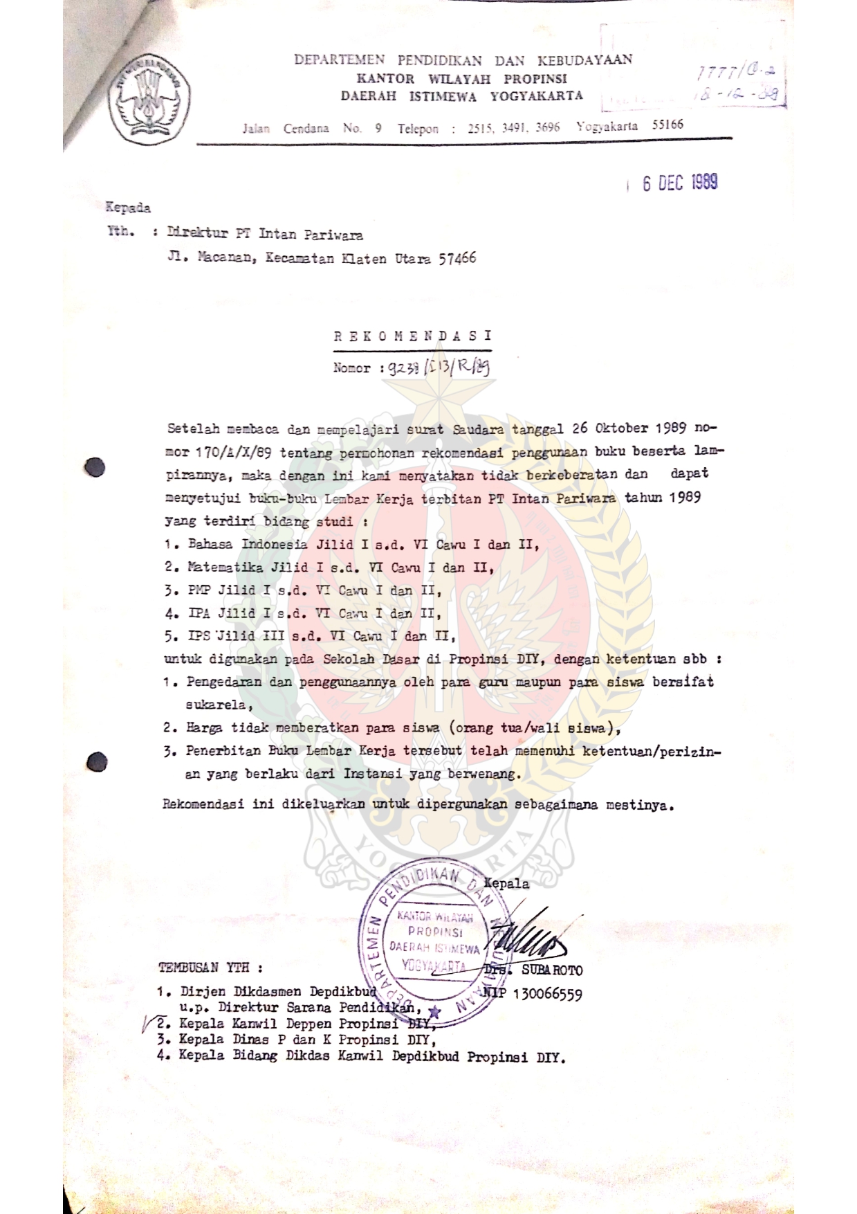 Surat dari Kepala Departemen Pendidikan dan Kebudayaa Kantor Wilayah Provinsi Yogyakarta kepada Direktur PT. Intan Pariwara mengenai persetujuan buku lembar kerja terbitan PT. Intan Pariwara untuk digunakan pada SD (Sekolah Dasar) di Provinsi Yogyakarta.