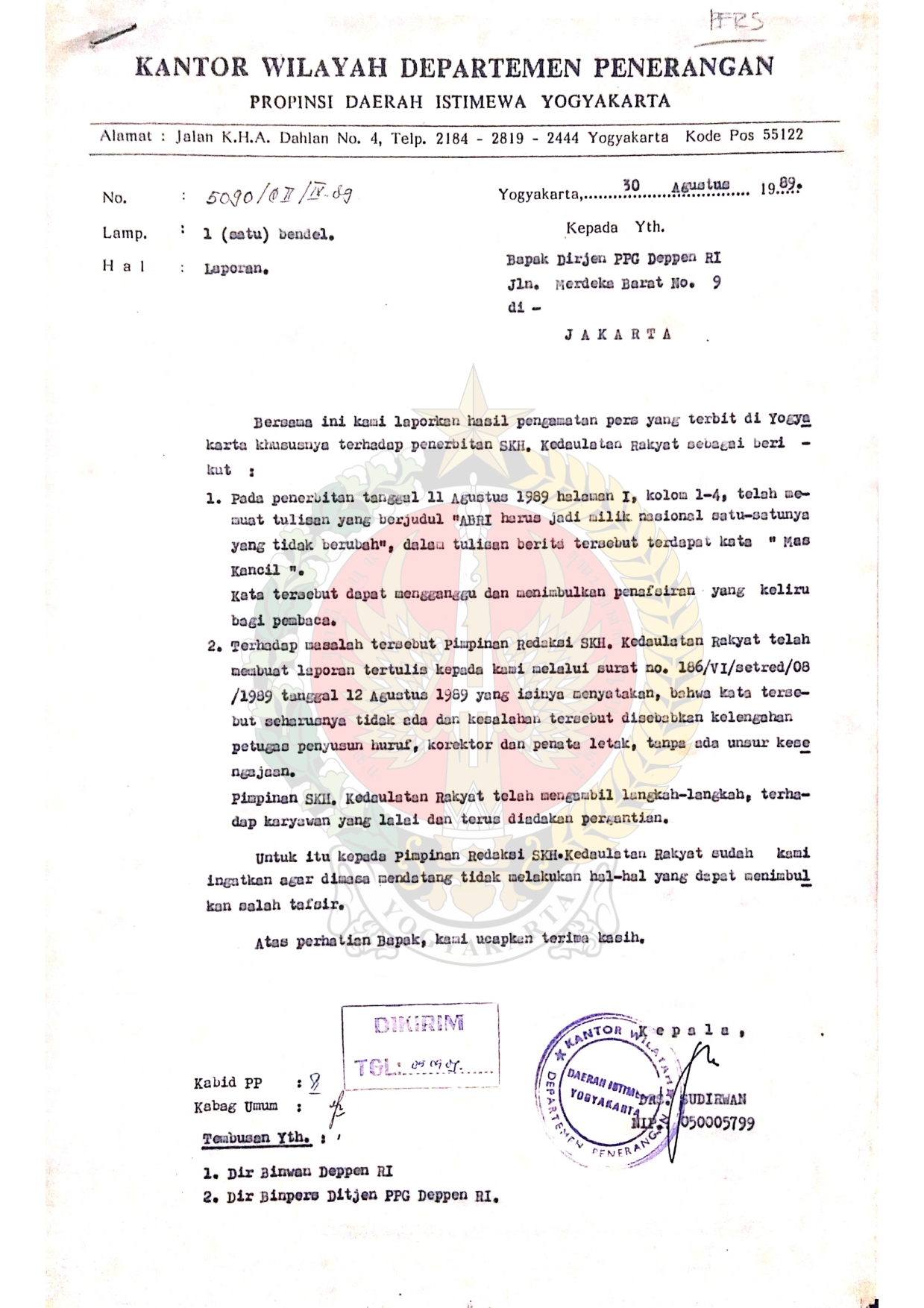Surat dari Kepala Kantor Wilayah Departemen Penerangan Provinsi Yogyakarta kepada Direktur Jenderal Pembinaan Pers dan Grafika Departemen Penerangan Republik Indonesia Jakarta perihal laporan hasil pengamatan pers yang terbit di Yogyakarta khususnya Surat Kabar Harian Kedaulatan Rakyat, beserta lampiran.